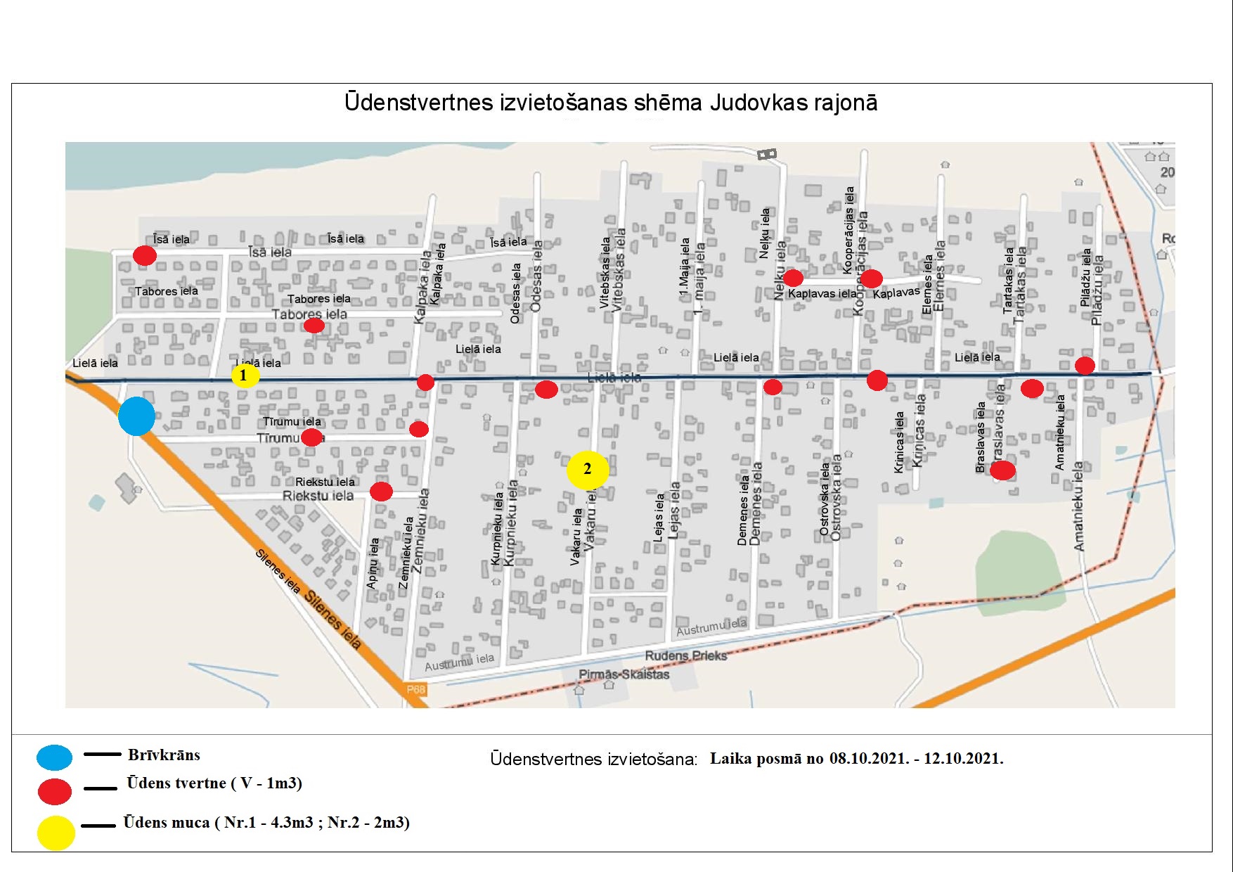 SIA “Daugavpils ūdens” paziņo, ka Judovkas mikrorajona iedzīvotāju nodrošināšanai ar ūdeni būvdarbu veikšanas laikā ar ūdens līmeņa pazemināšanu projekta “Ūdensapgādes un kanalizācijas sistēmas attīstība Judovkas rajonā, Daugavpilī” ietvaros , laika posmā no š.g. 8.oktobra līdz 12.oktobrim papildus iespējai izmantot brīvkaršu šajā rajonā tiek novietotas 16 ūdens tvertnes ar dzeramo ūdeni – sk. ūdens tvertnes izvietošanas vietas